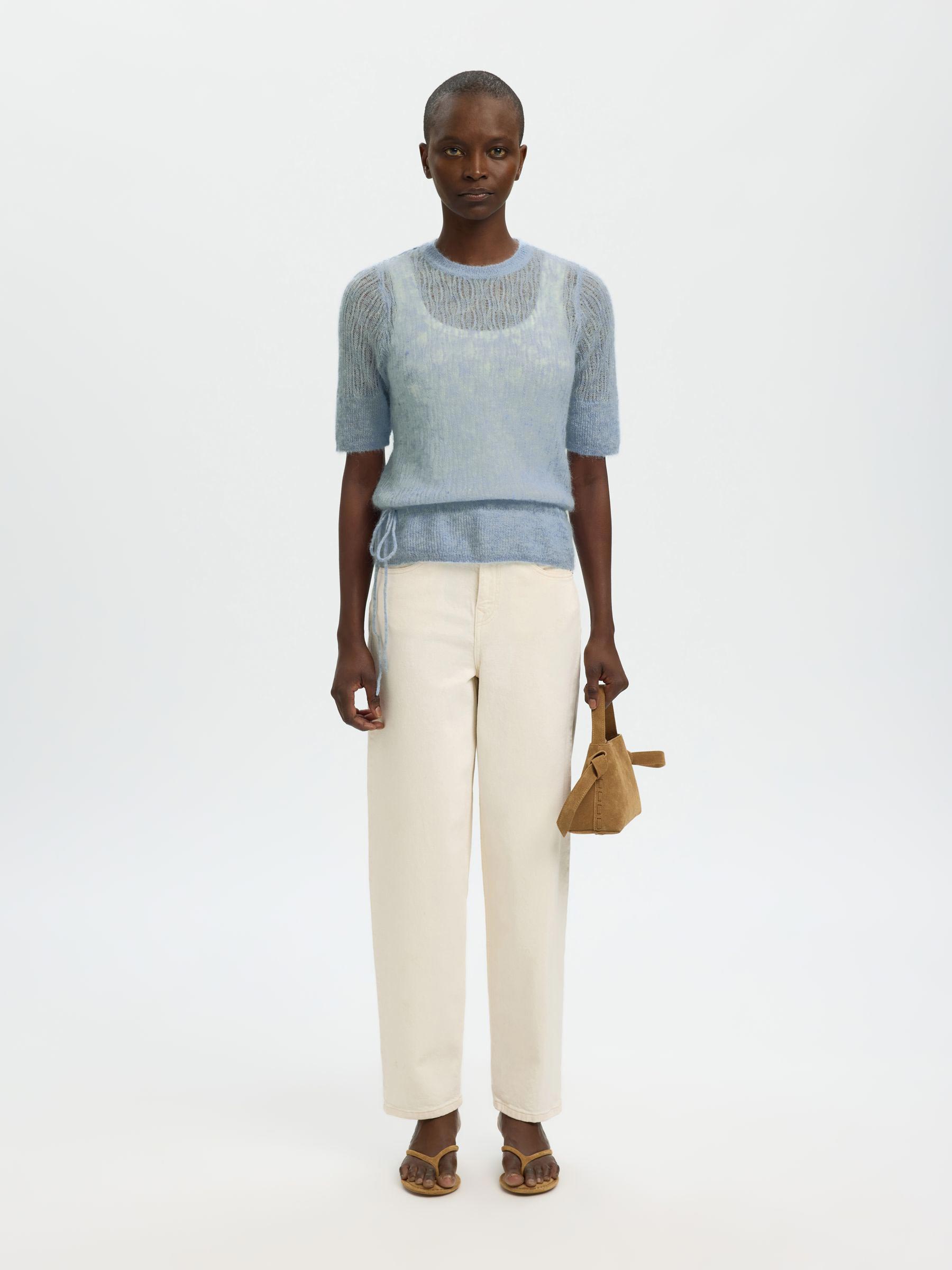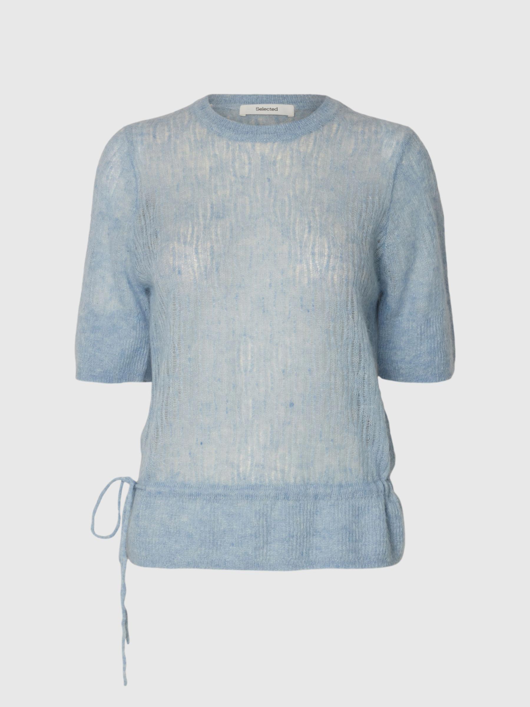 De lichtblauwe Mayer top van Selected Femme is bijna doorzichtig van het fijne open breiwerk, en dat is precies de bedoeling. De mohair-alpaca mix geeft hem die zachte, donzige uitstraling, terwijl de koordjes aan de taille voor net wat meer vorm zorgen.
