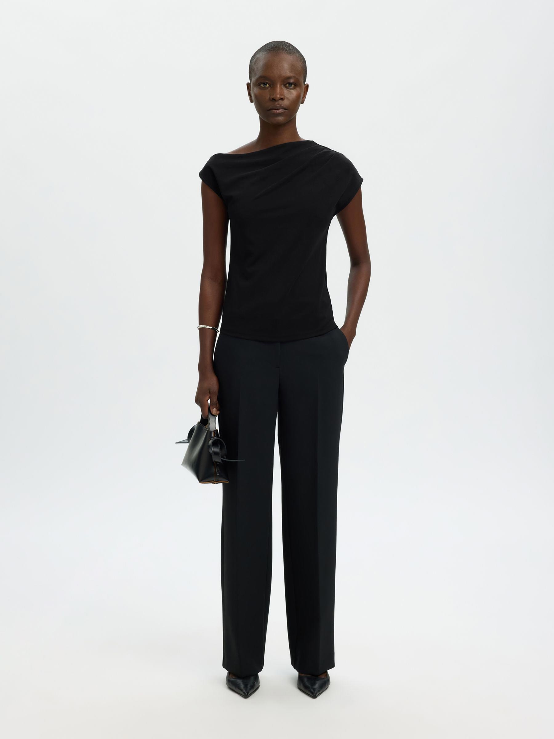 Deze zwarte top van Selected Femme is perfect als stijlvolle basis met een verrassend detail bij de hals. De zachte stof valt mooi om het lichaam en geeft je look direct een vrouwelijke, cleane uitstraling. Draag casual op een jeans of juist chic met een pantalon voor een effortless dag tot avond look.