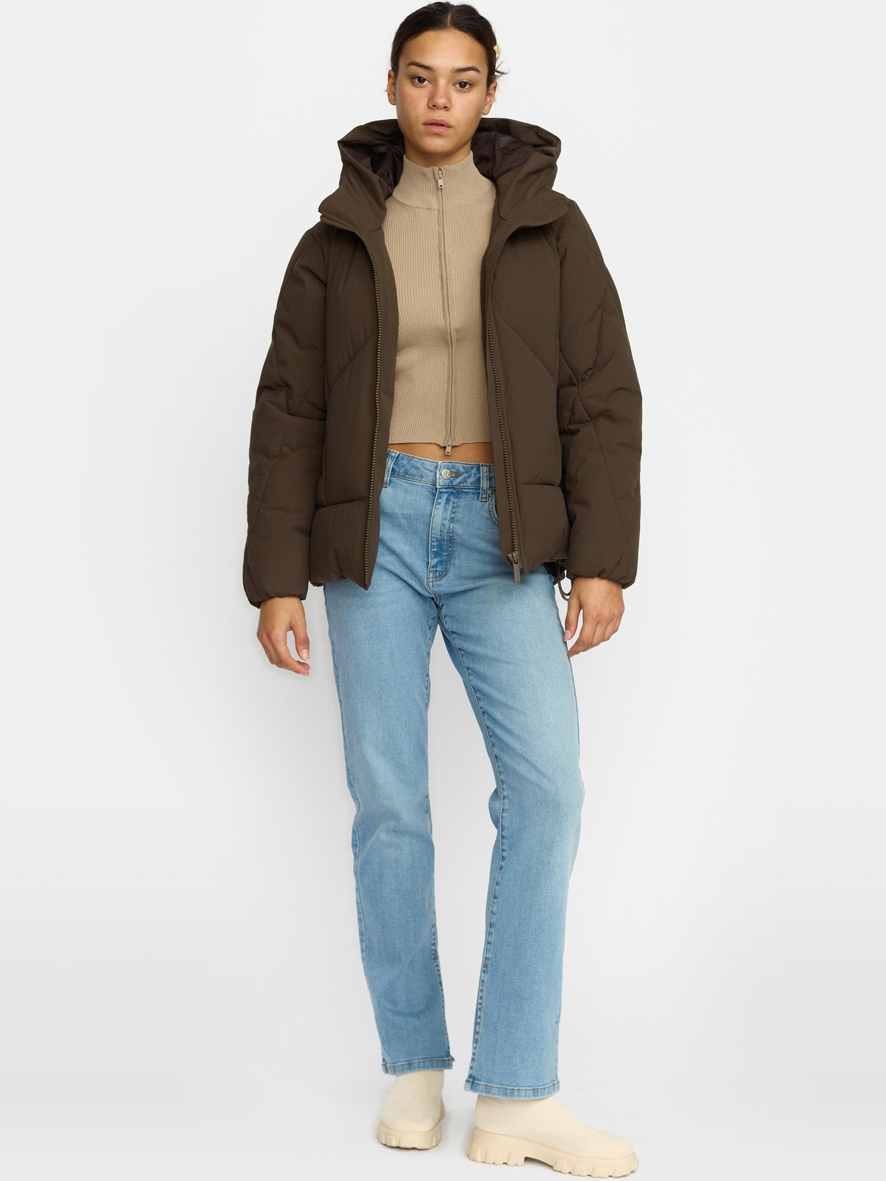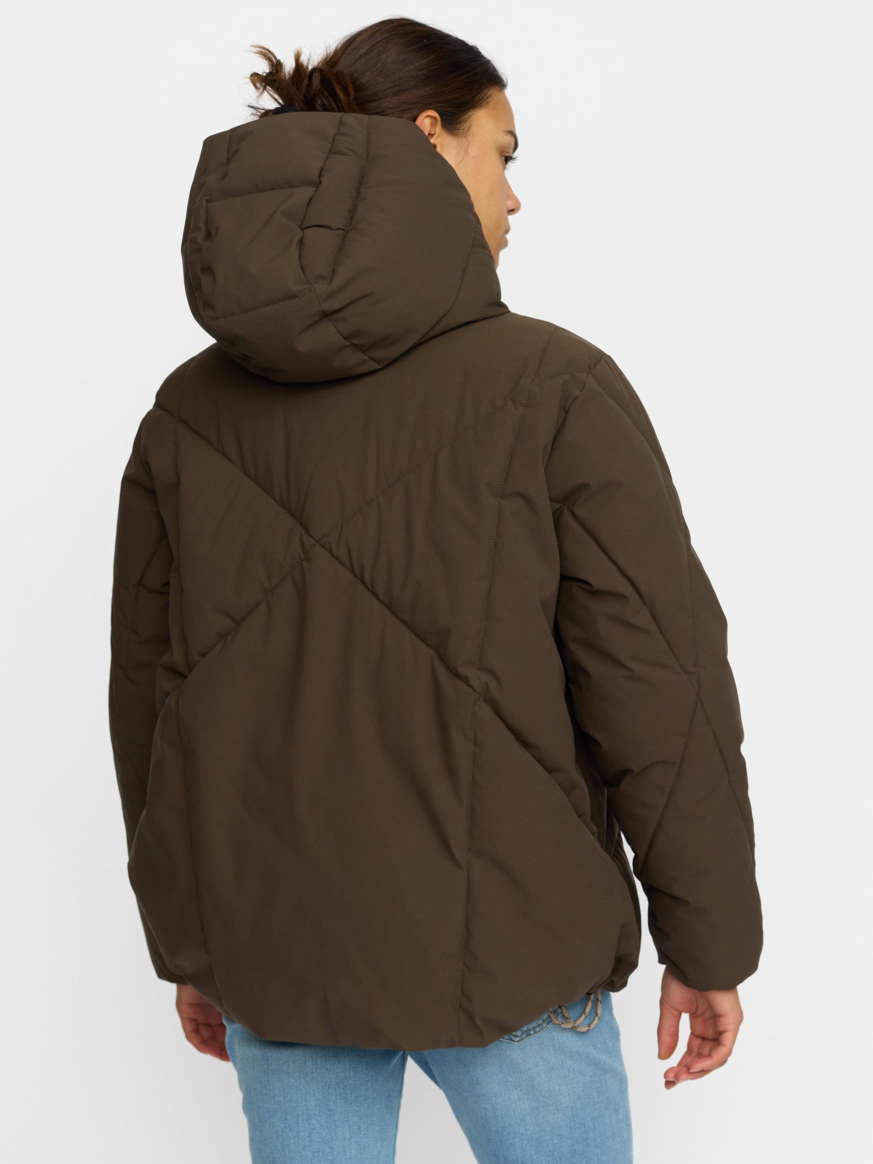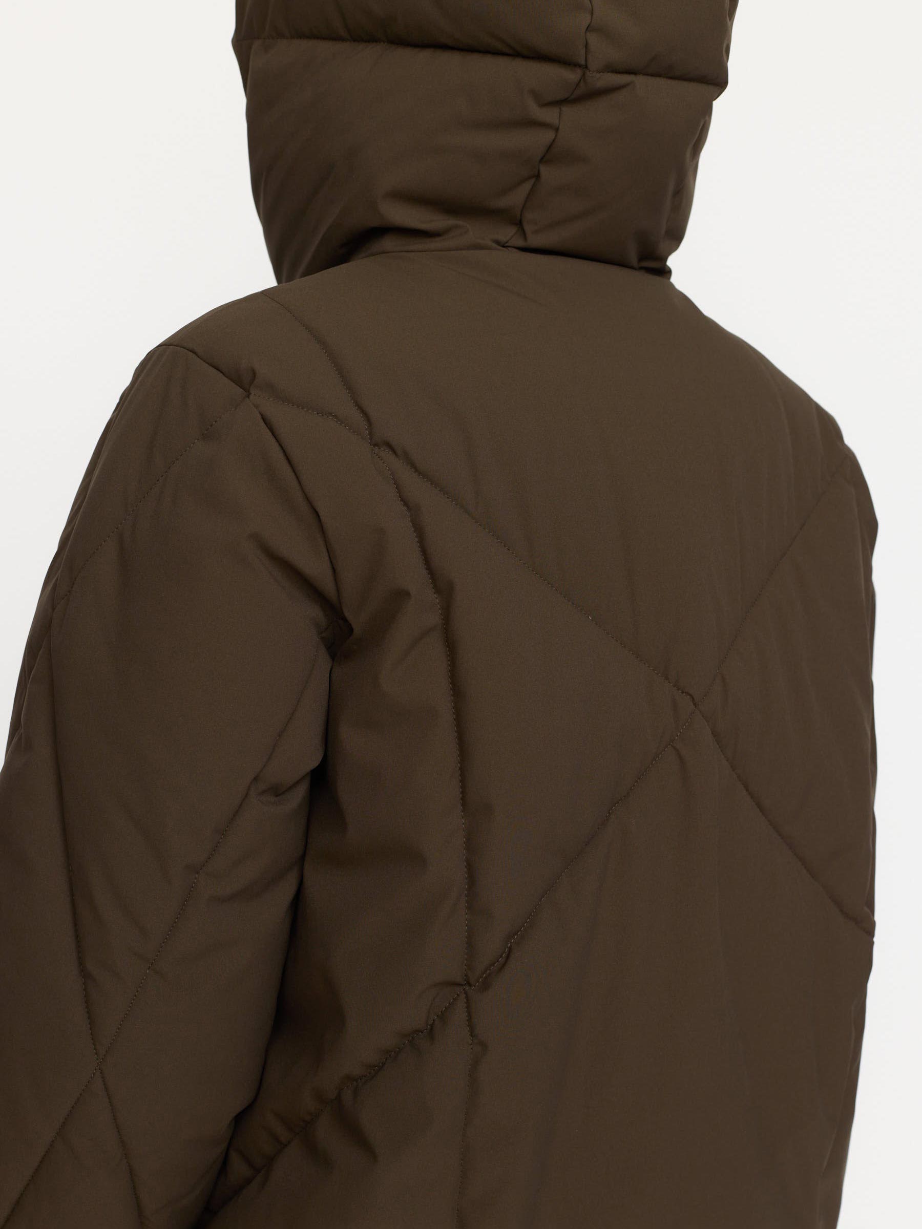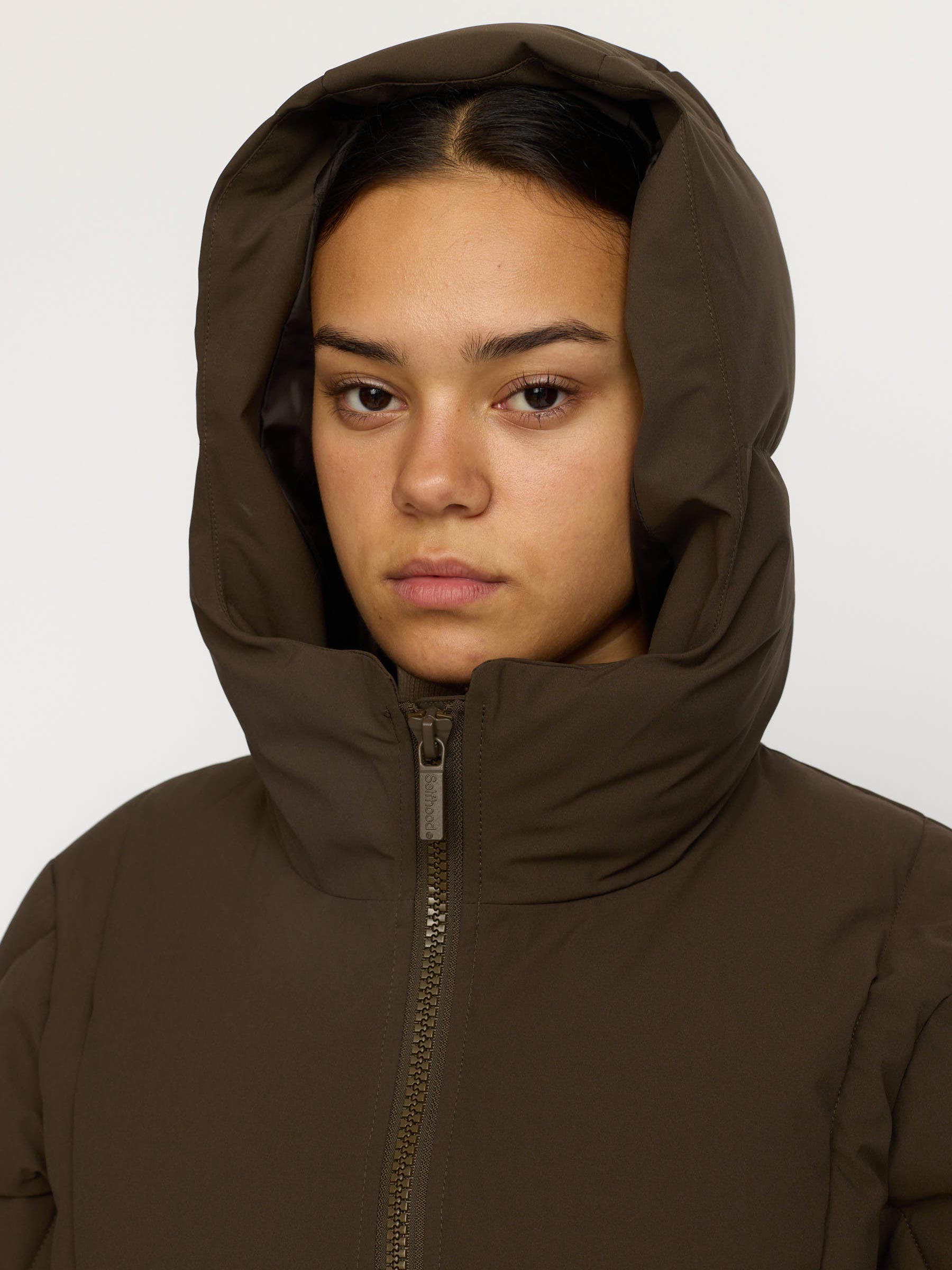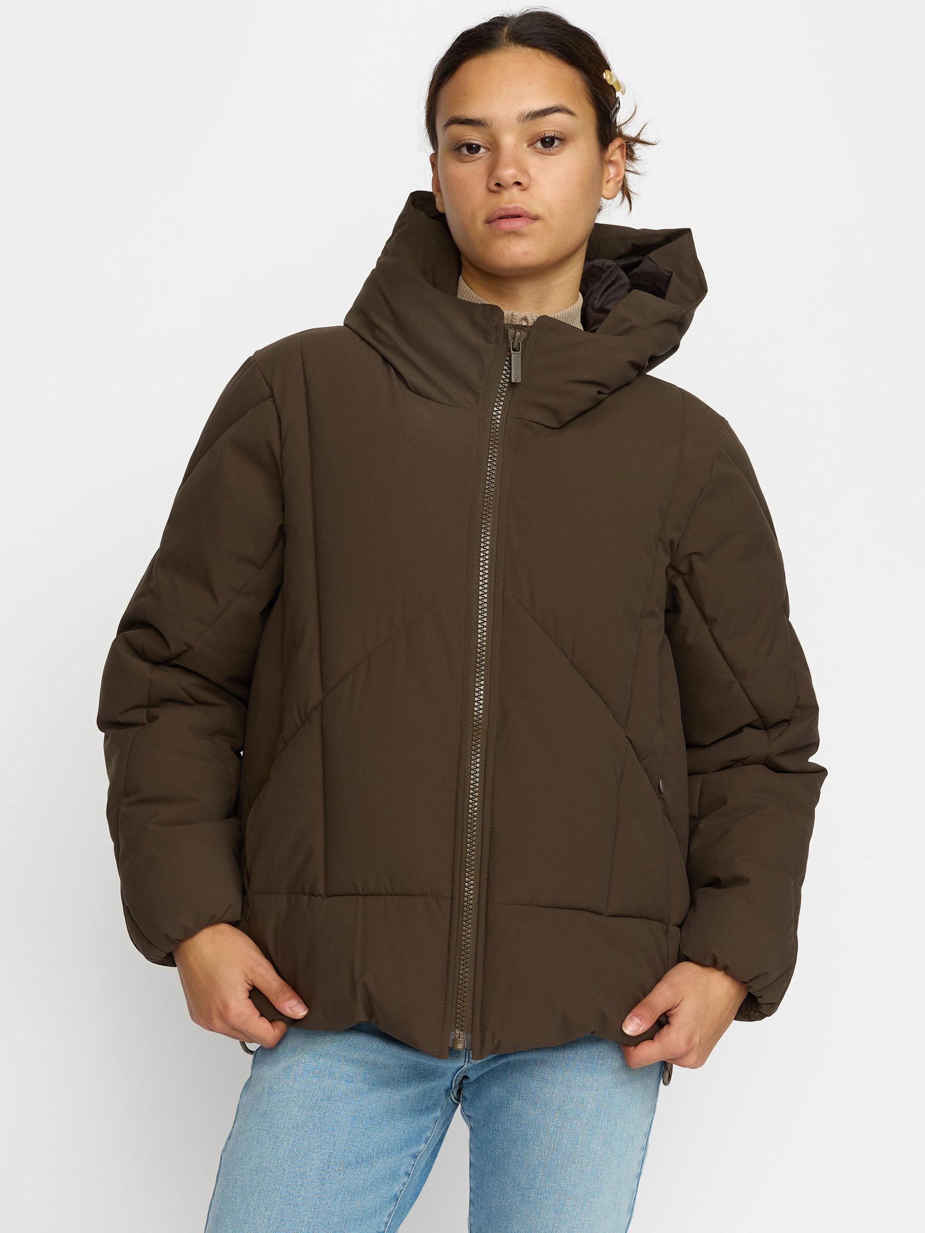 Deze bruine puffer jas van Selfhood is gemaakt om je warm te houden op koude dagen. De zachte, matte stof en ruime capuchon zorgen voor comfort met een moderne uitstraling. Combineer met een wollen sjaal en stoere laarzen voor een sterke winterlook.