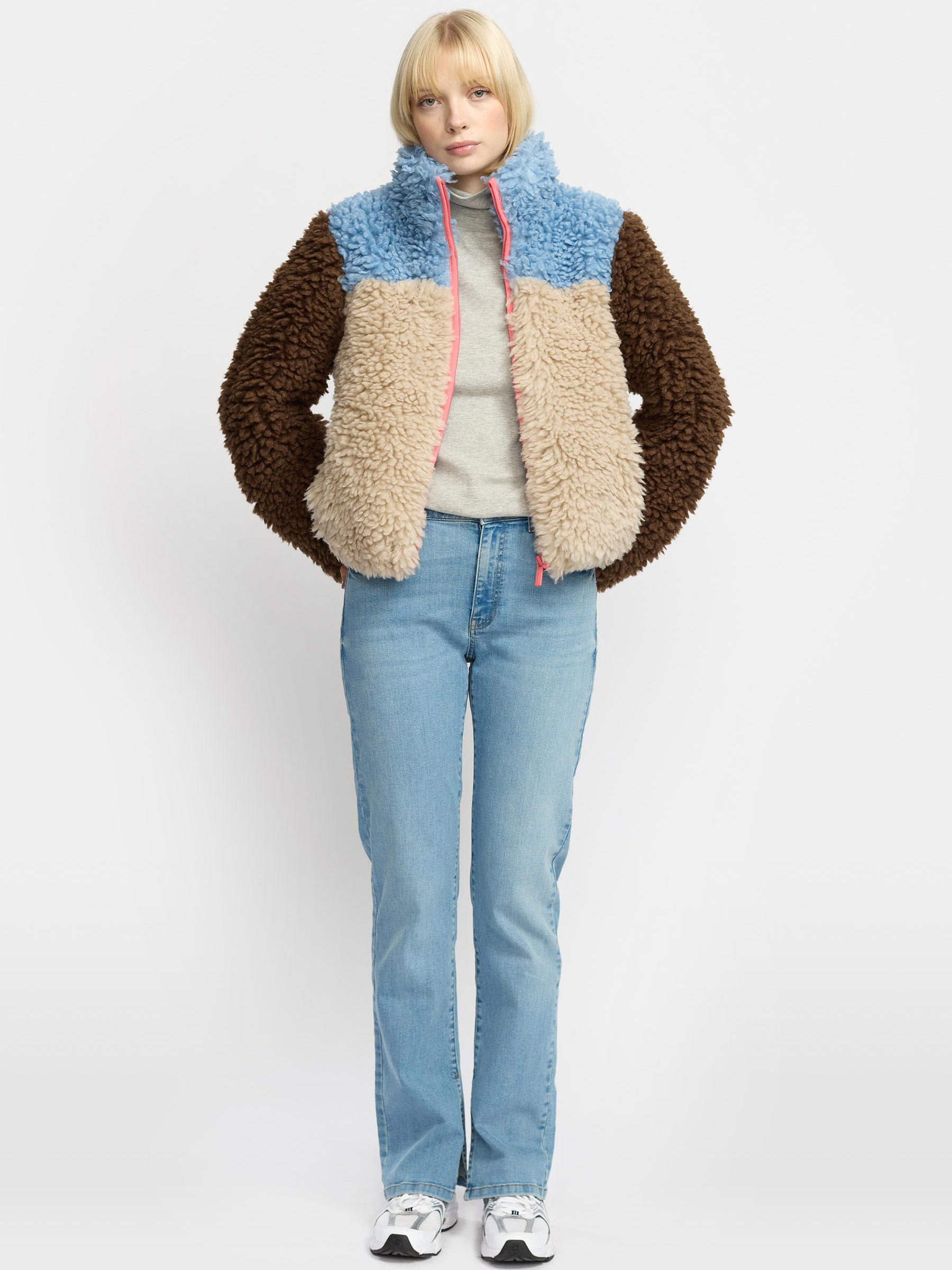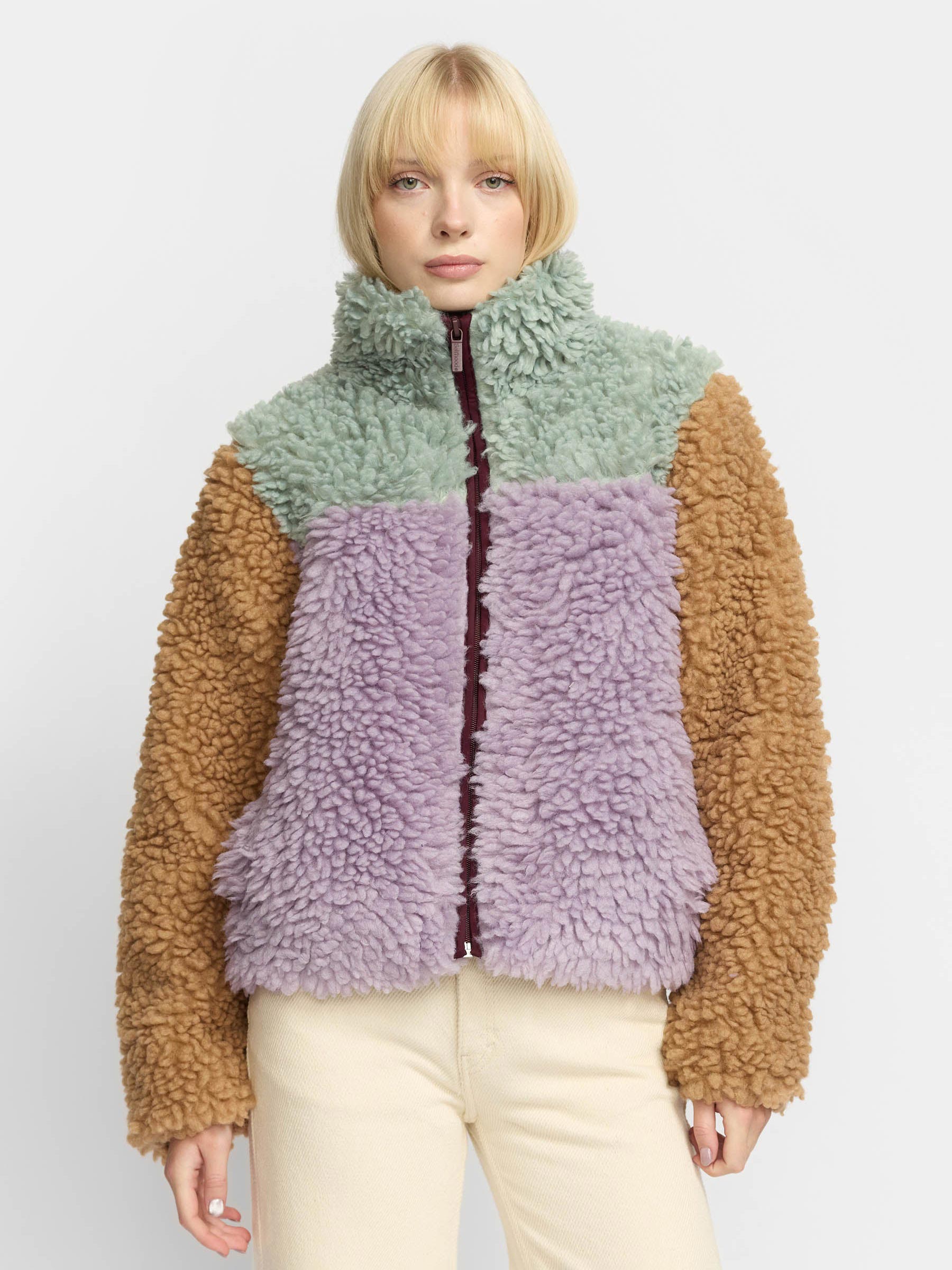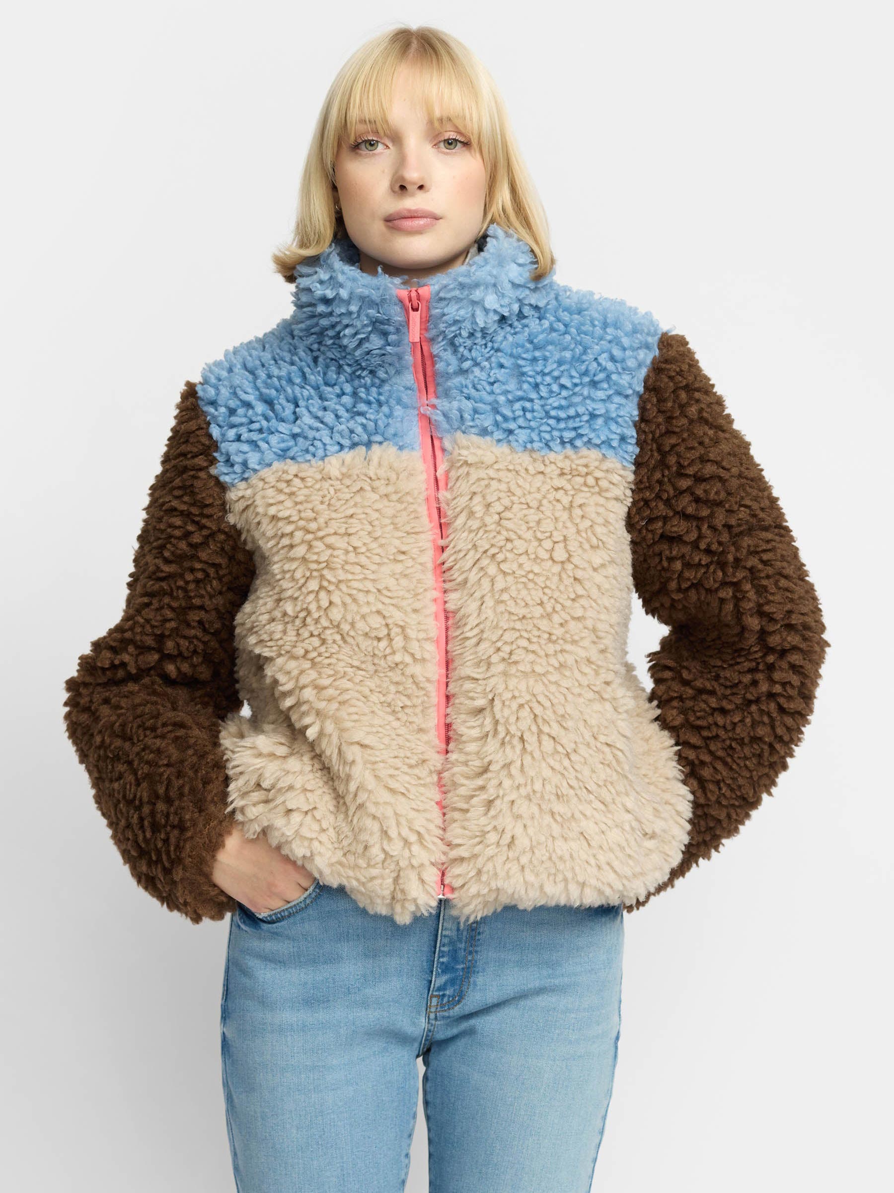 Dit teddy jack van Selfhood brengt kleur in koude dagen. De blokverdeling met zachte tinten en fluffy structuur zorgt voor een opvallende, cozy look. Gemaakt van gerecycled polyester en heerlijk warm — ideaal voor frisse herfstwandelingen of een city stroll.