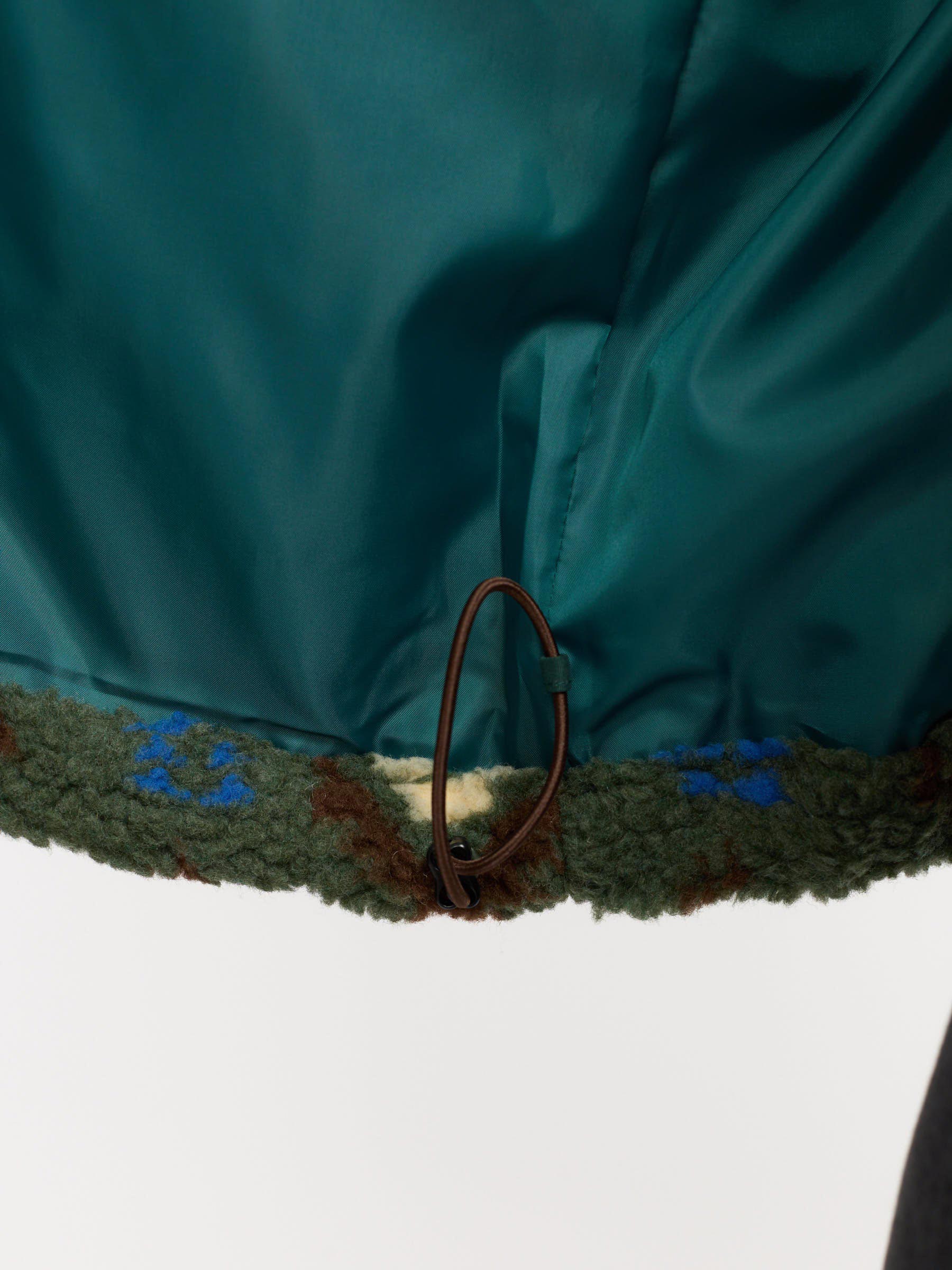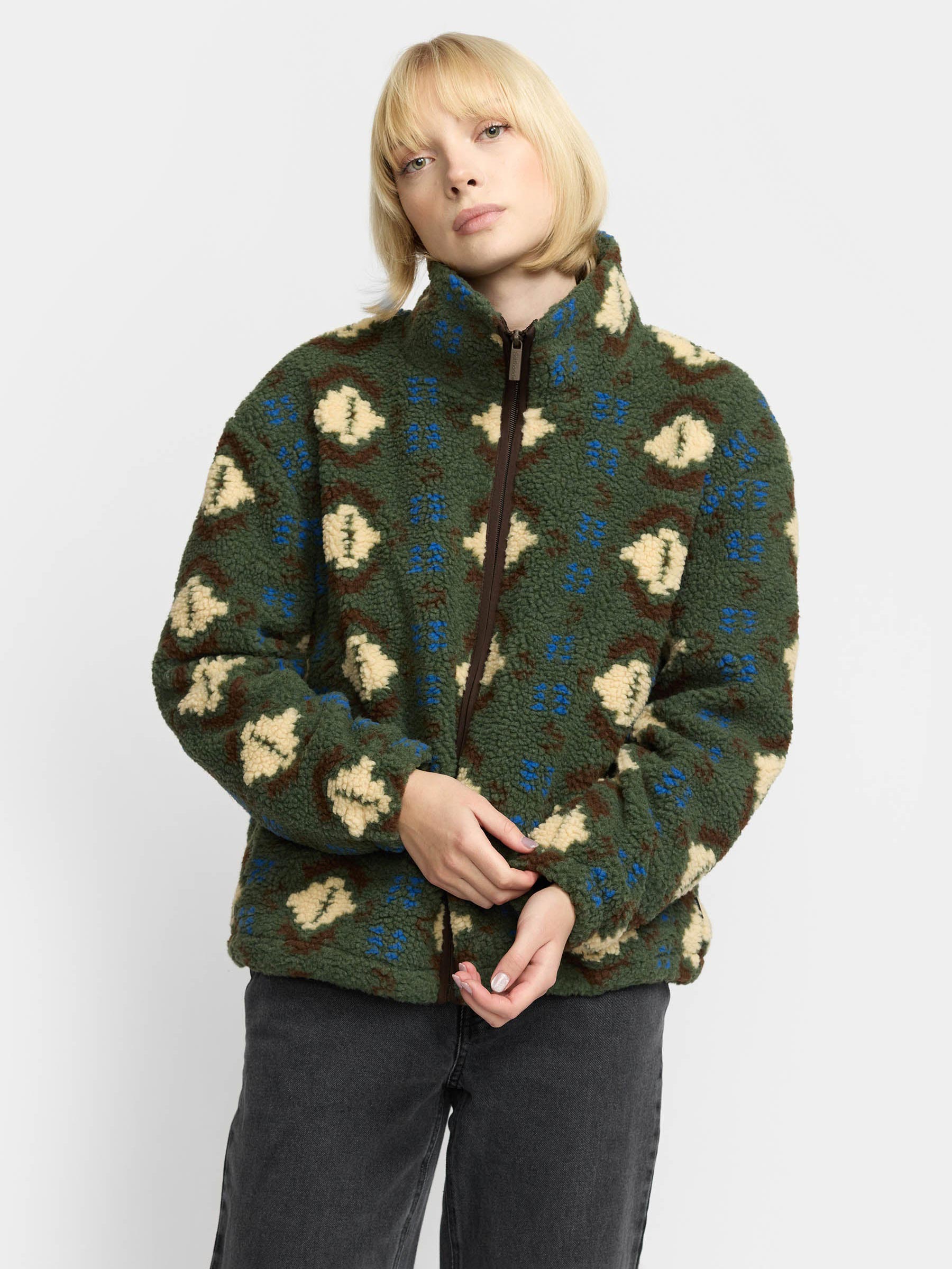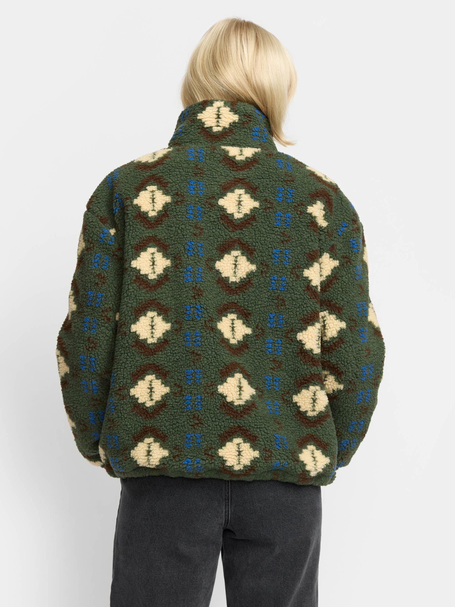 Dit groene teddy jack van Selfhood is een echte eye-catcher. Het grafische patroon in crème en blauw geeft een retro gevoel, terwijl de zachte teddy stof heerlijk warm aanvoelt. Combineer met een jeans of cargobroek voor een stoere, cozy look.