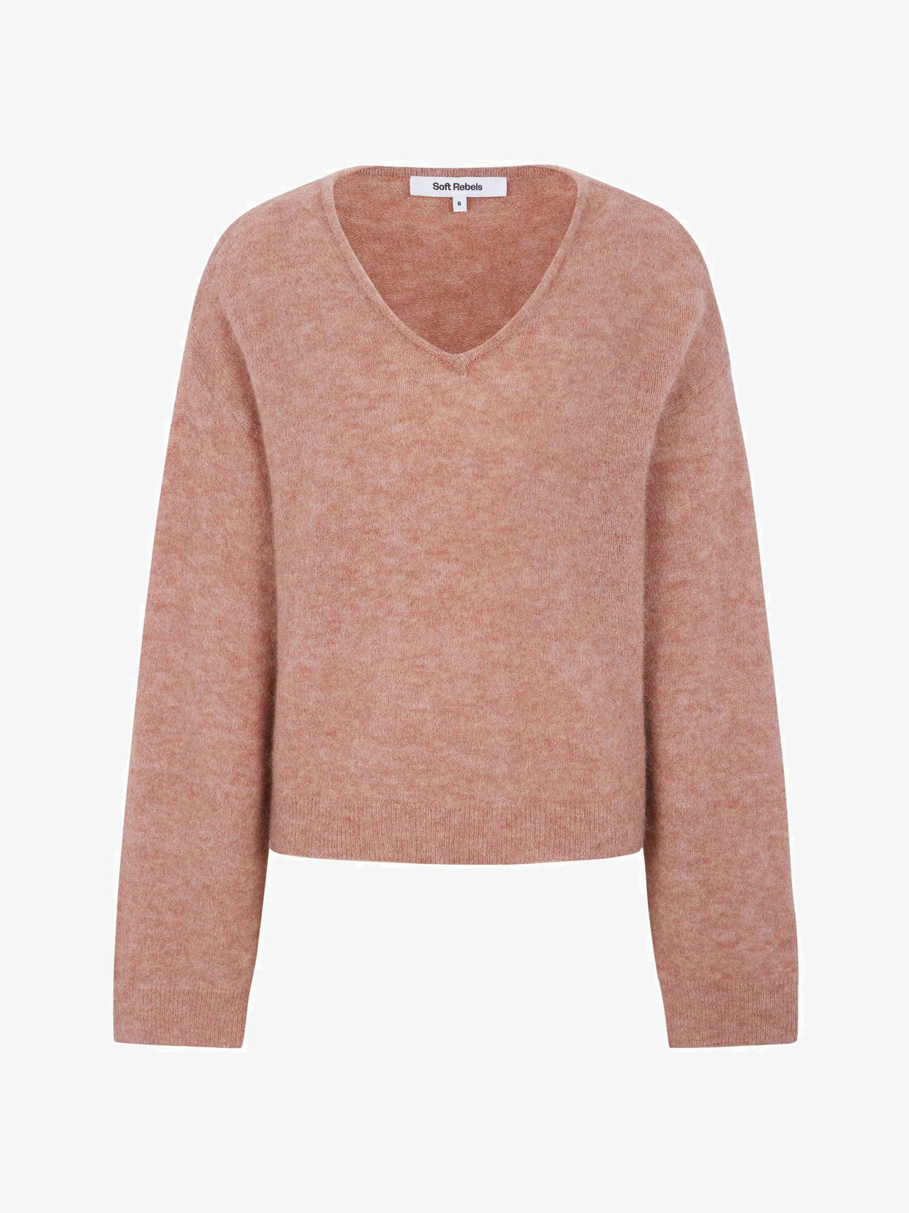 Deze roze trui van Soft Rebels is zacht, vrouwelijk en helemaal klaar voor het nieuwe seizoen. De relaxte fit en diepe V-hals maken hem perfect voor laagjes of gewoon zo, met je favoriete jeans of pantalon. Gemaakt van een comfortabele wolblend die warm aanvoelt en mooi valt.