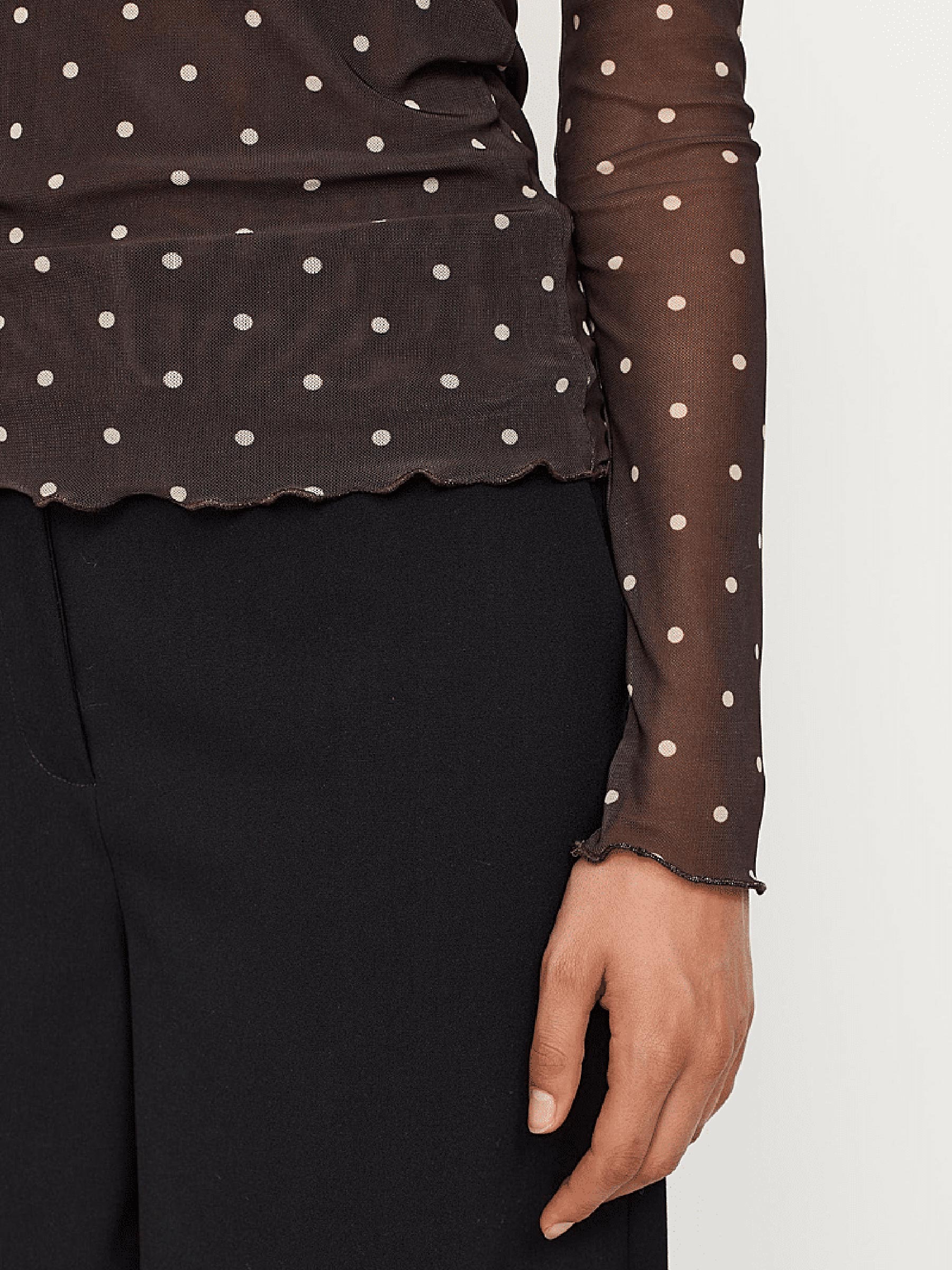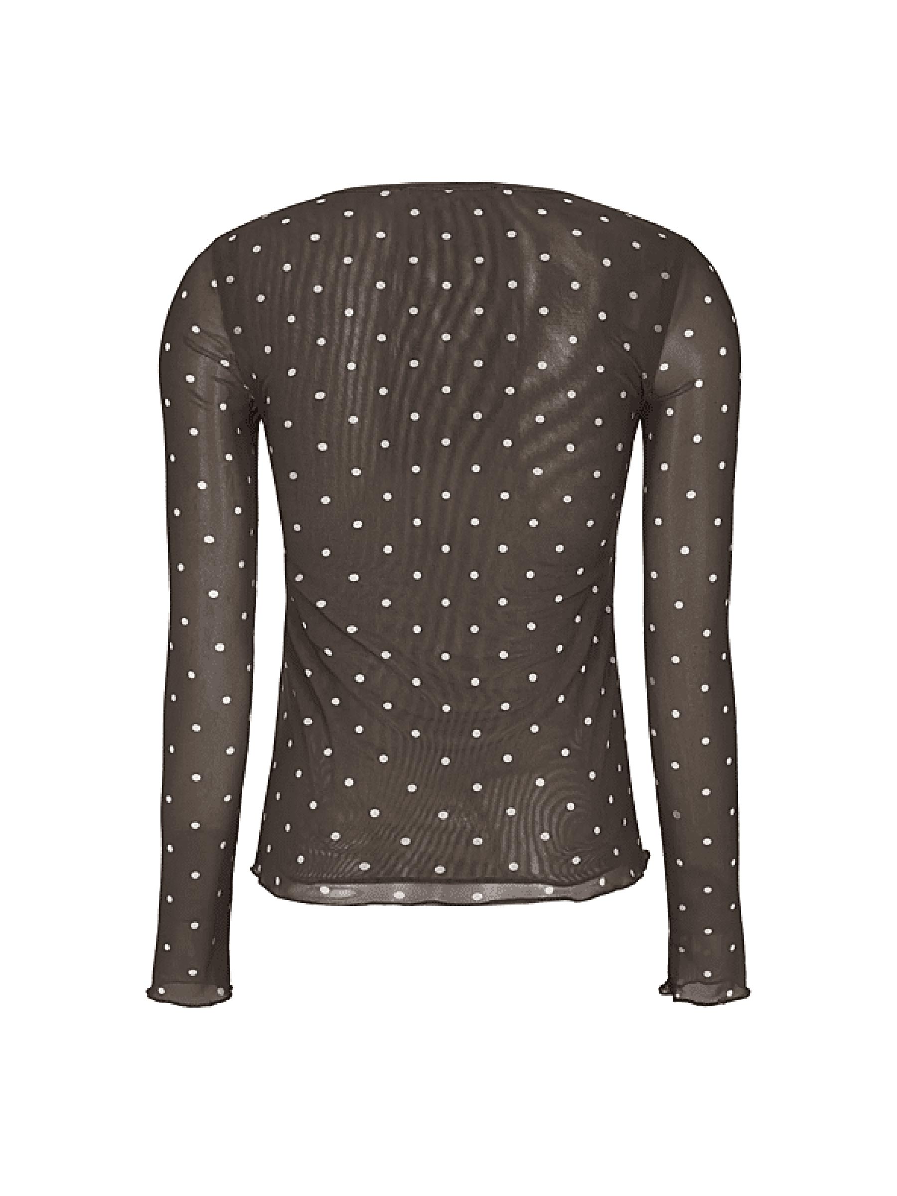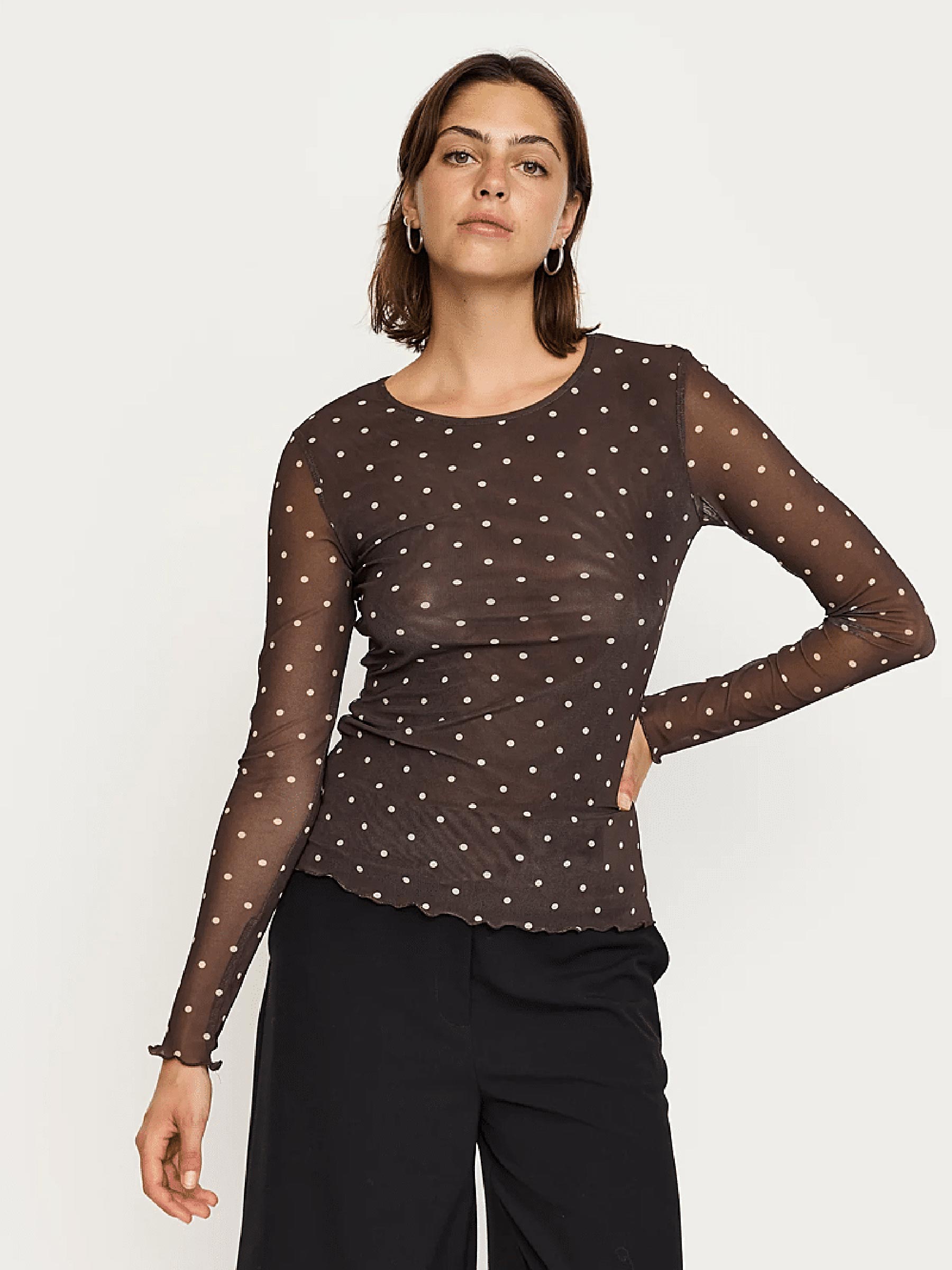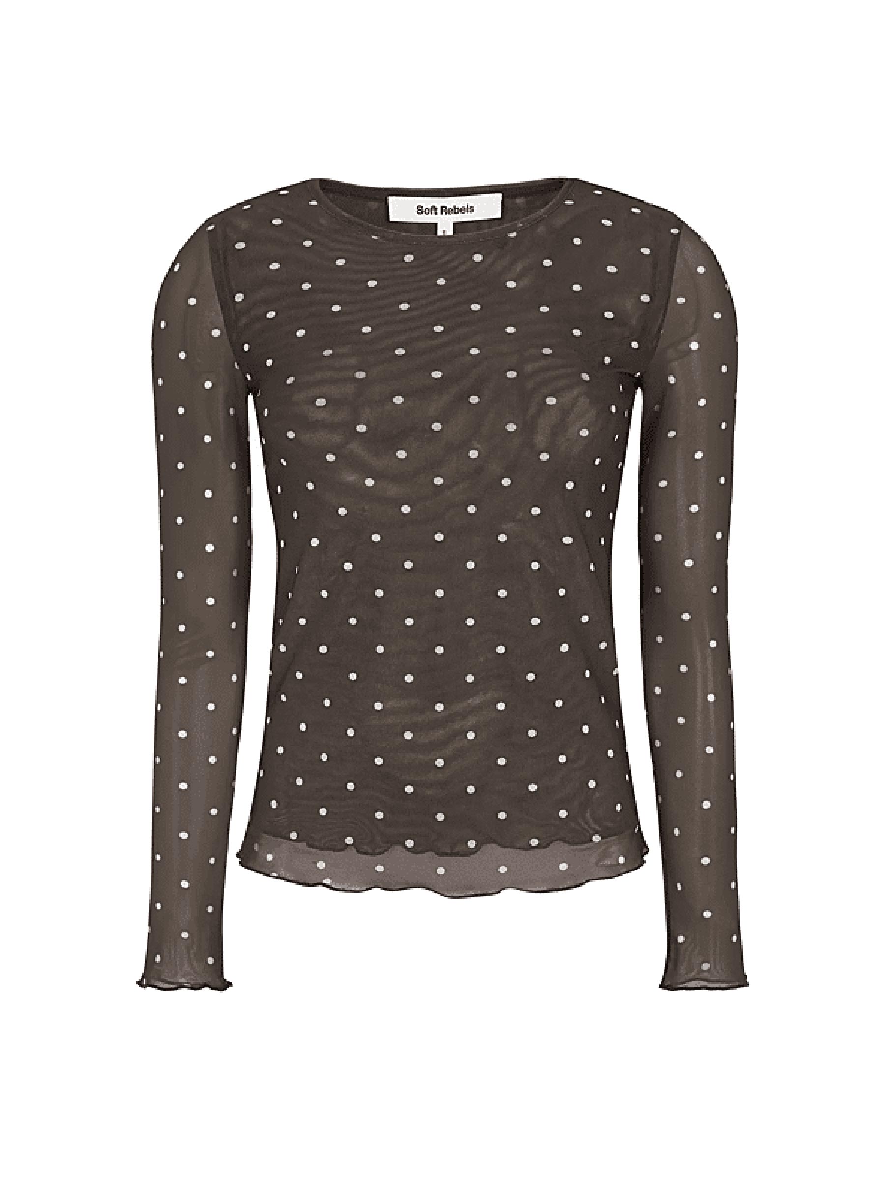 Deze bruine mesh longsleeve van Soft Rebels geeft je outfit meteen een speelse upgrade. De subtiele polkadots en de vrouwelijke ronde hals maken dit shirt perfect om solo te dragen of als laagje onder een blazer of trui. Een echte allrounder voor elke dag.