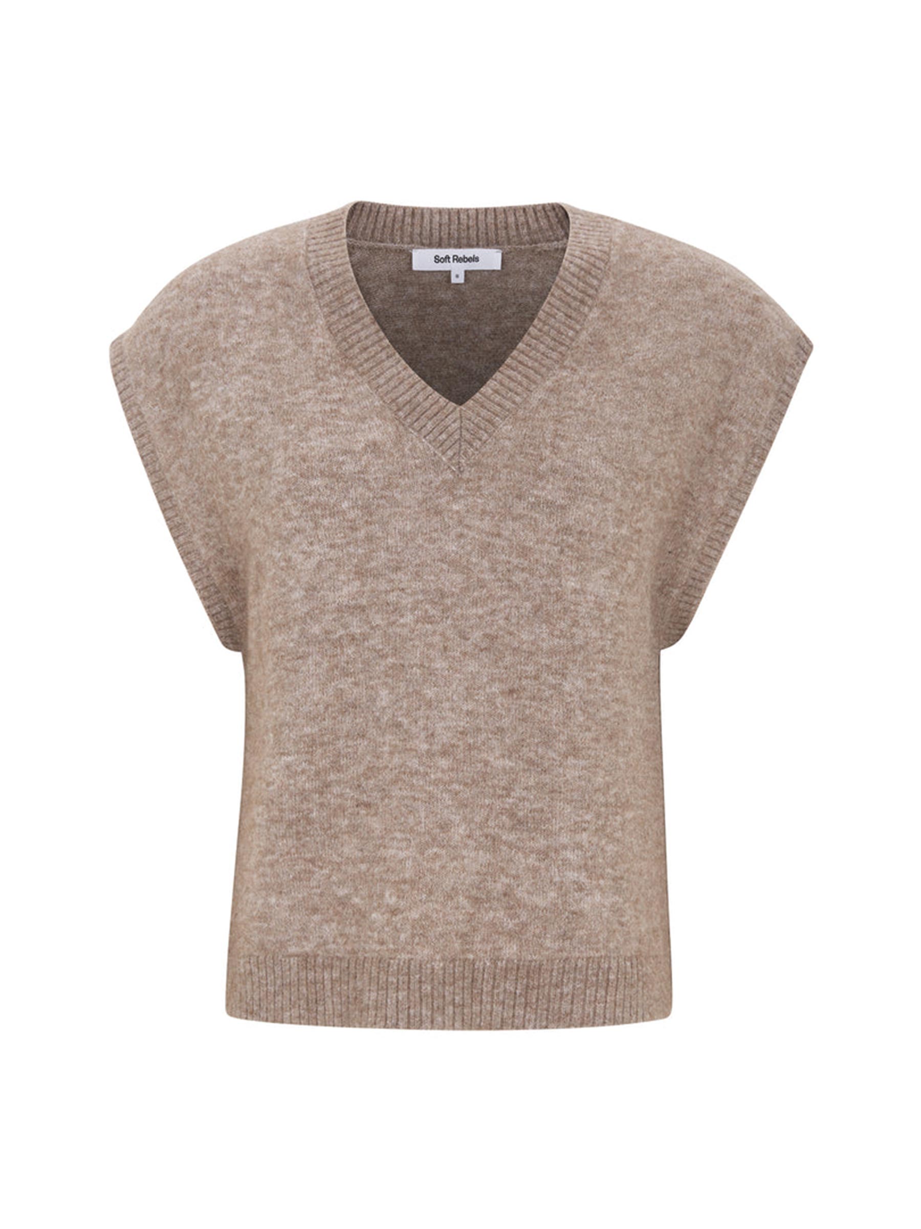 Deze lichtbruine gebreide spencer van Soft Rebels is de perfecte extra laag voor het najaar. De V-hals en relaxte fit maken hem ideaal om over een blouse te dragen. Gemaakt van een zachte mix met gerecycled polyester voor een comfortabele fit met een duurzame touch.