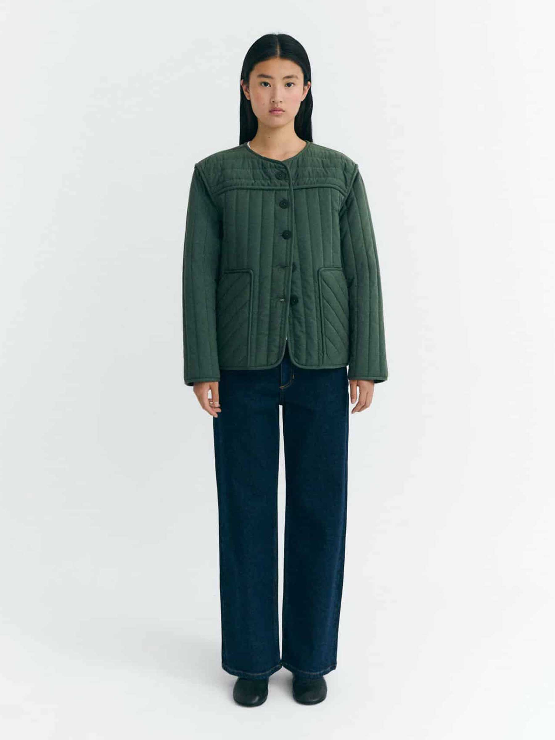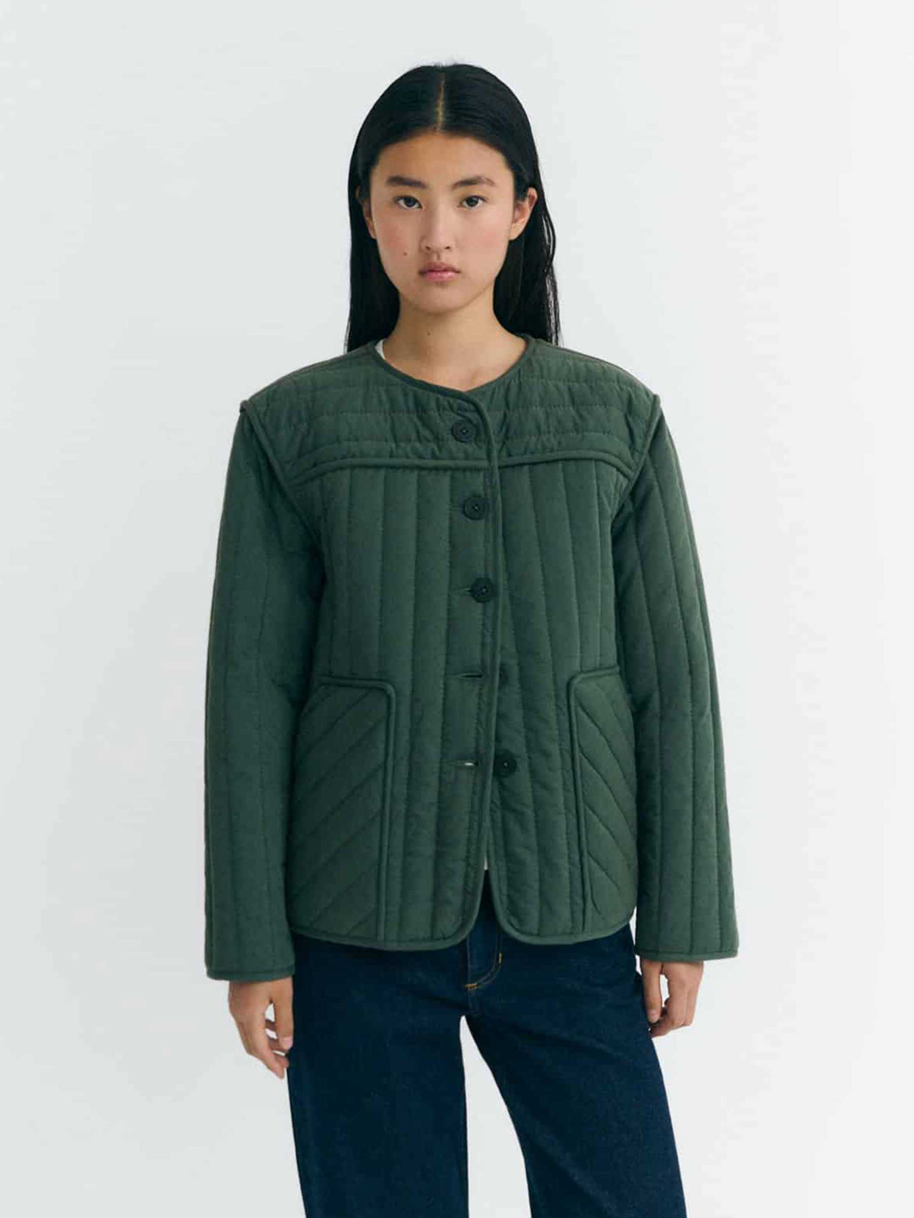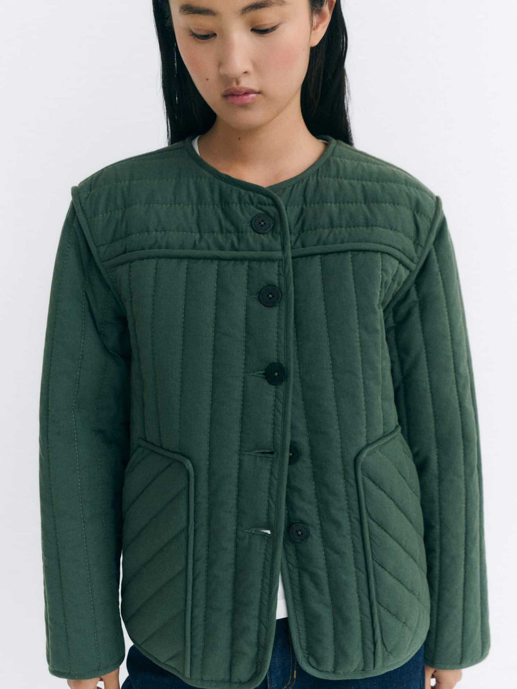 Dit groene quilted jacket van Thinking MU is een modern en comfortabel item voor het tussenseizoen. Het lichtgewicht design met ronde hals en grote knopen geeft een eigentijdse uitstraling en maakt hem ideaal voor laagjeslooks.