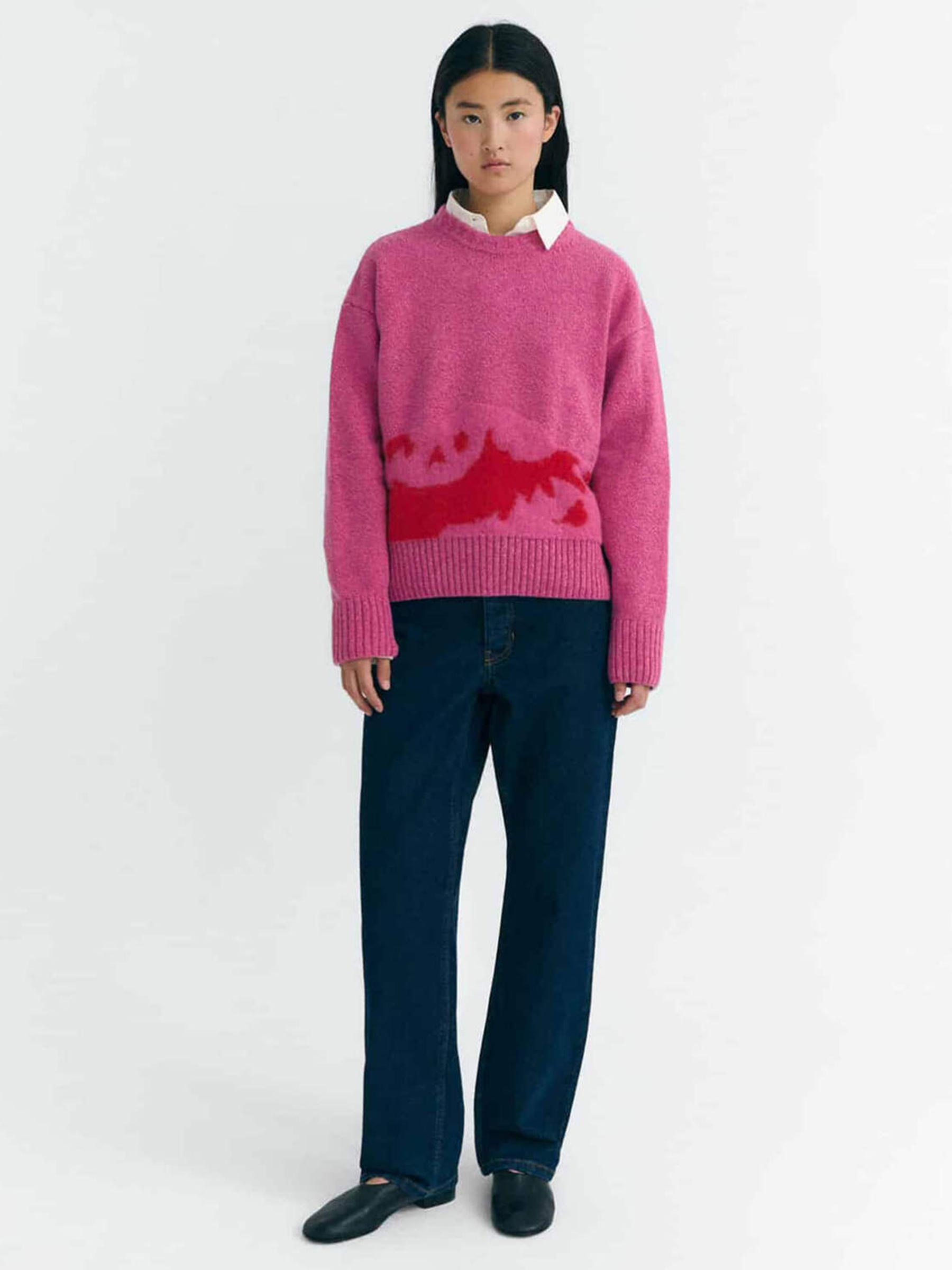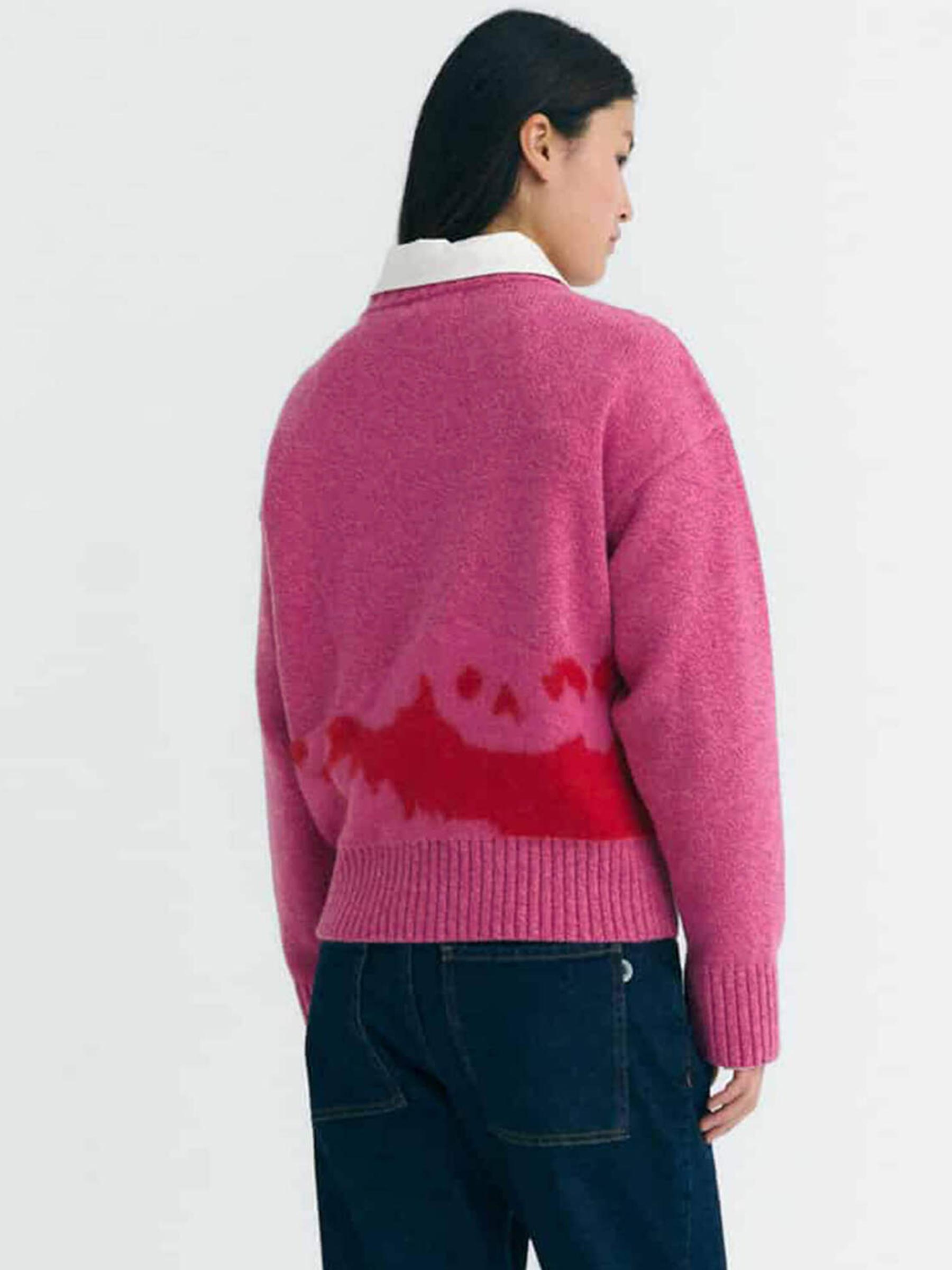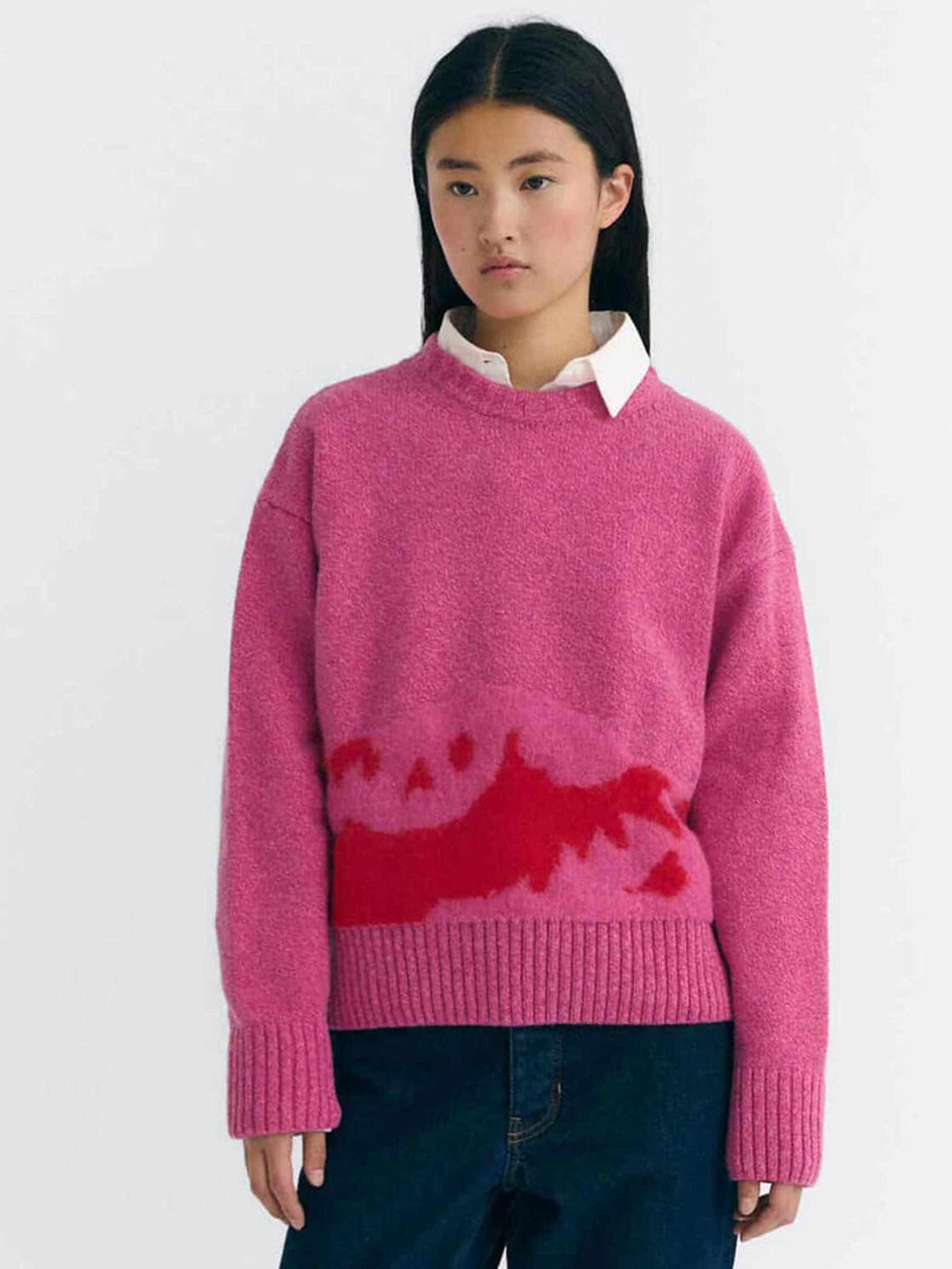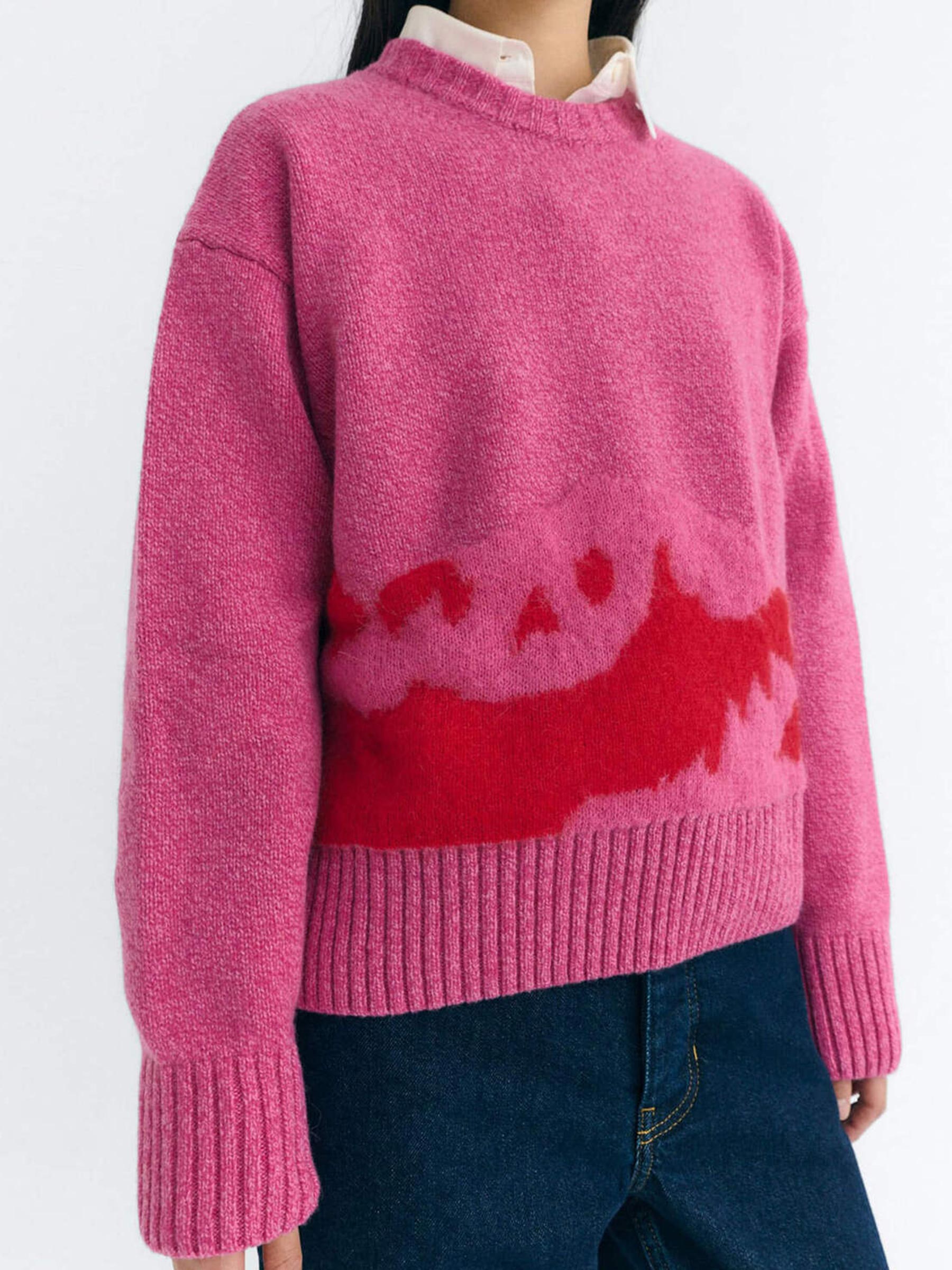 Deze roze trui van Thinking MU is een vrolijke blikvanger met zijn abstracte rode print. De zachte wolmix en relaxte pasvorm maken hem comfortabel én stijlvol. Perfect om je outfit een speels kleuraccent te geven, of je nu voor denim of een nette broek kiest.