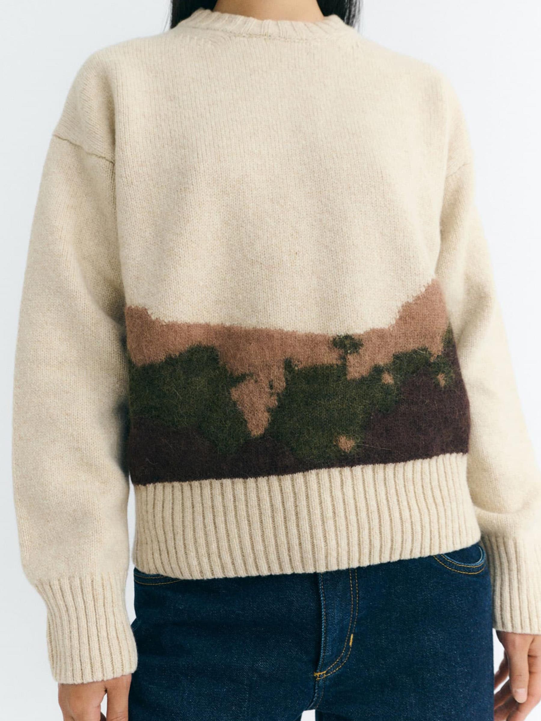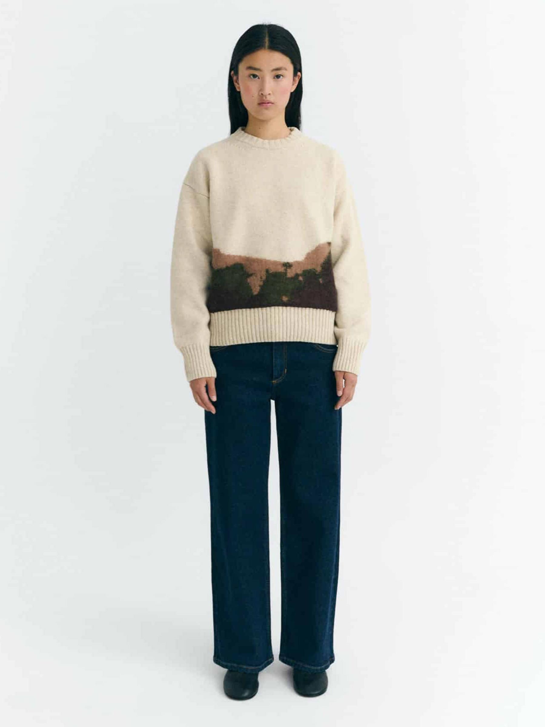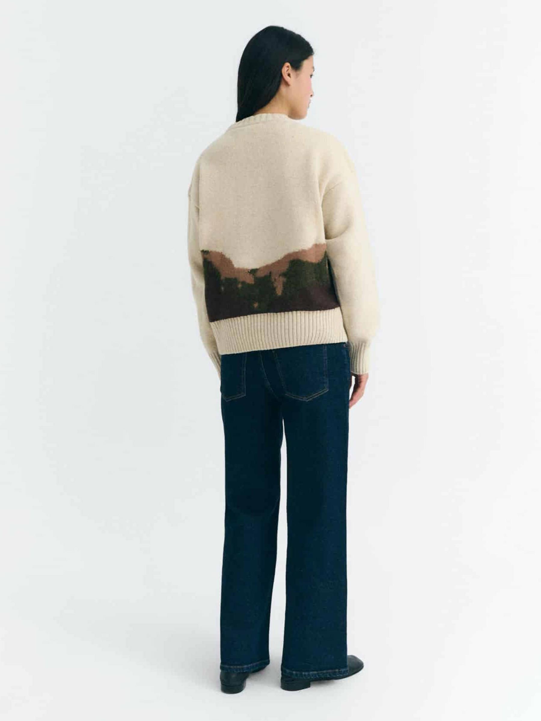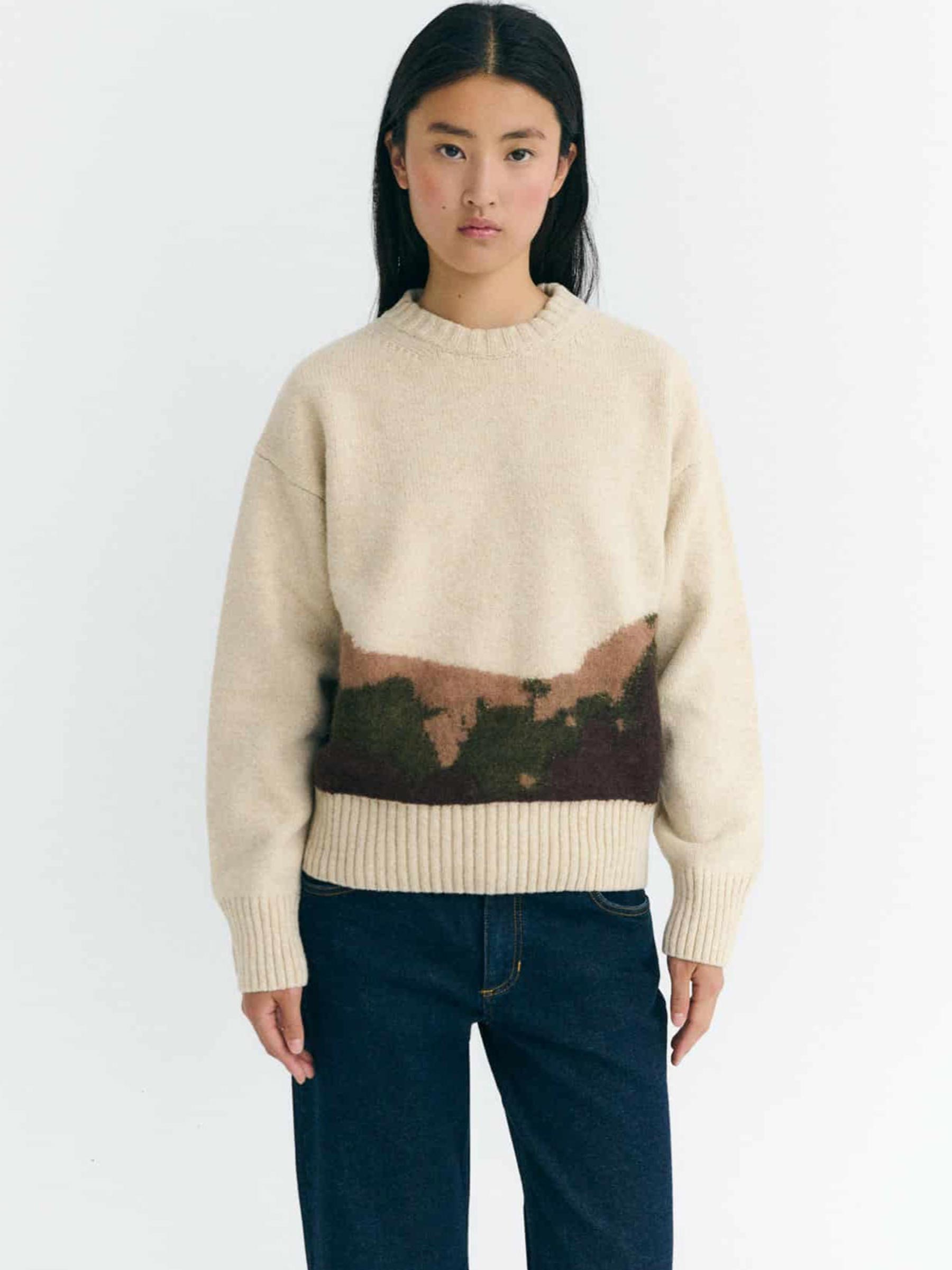 Deze beige trui van Thinking MU heeft een kunstzinnige uitstraling door het brede gekleurde patroon in warme tinten. Het zachte breisel en de relaxte pasvorm maken dit een comfy favoriet die je eindeloos combineert. Perfect met denim of als opvallend item in een rustige look.