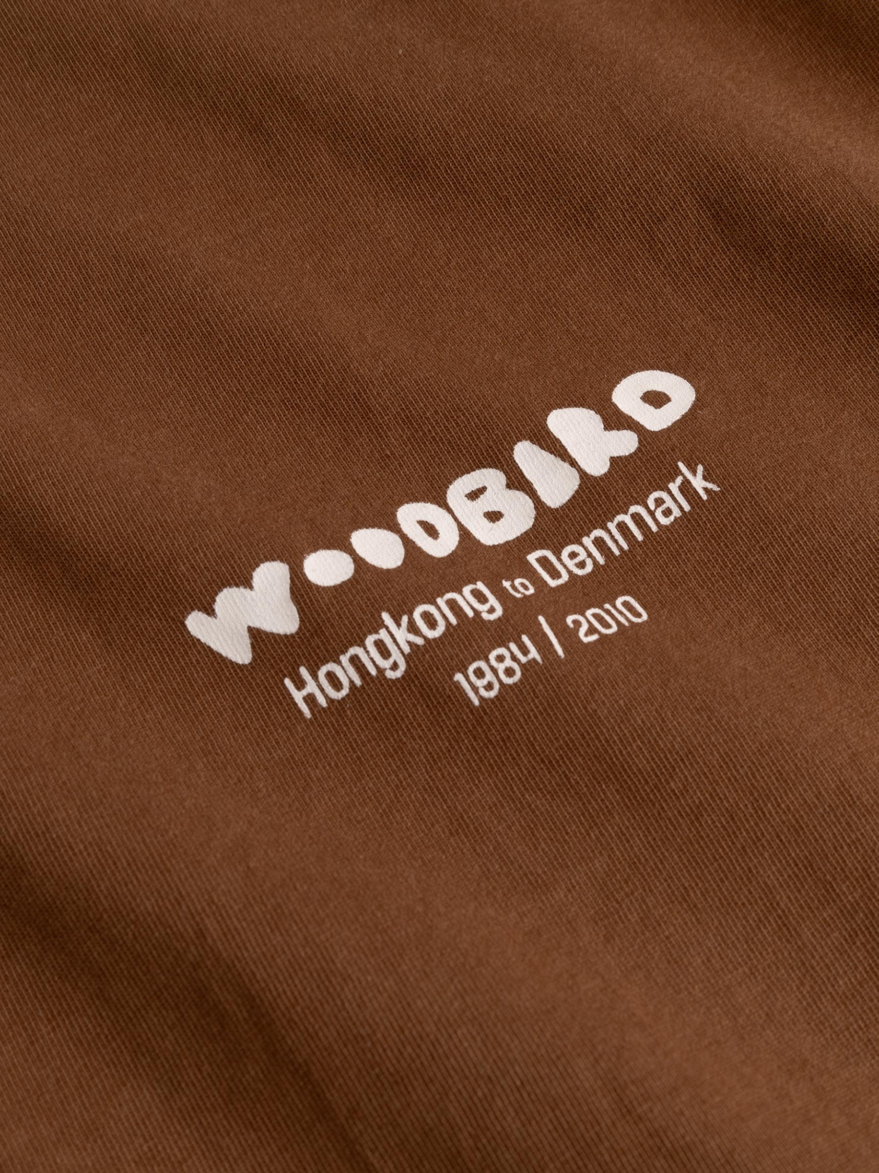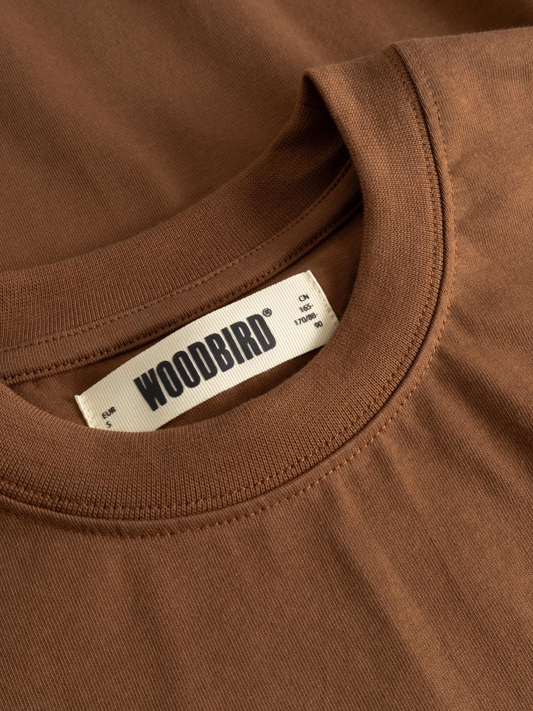 Dit bruine T-shirt van Woodbird houdt het aan de voorkant rustig met een klein logo op de borst, maar draai je om en daar verschijnt een speelse illustratie van een noedels met de tekst "I Don't Wok Here". De zware, dikke katoenen stof voelt premium aan en de oversized pasvorm geeft je dat relaxte streetwear gevoel waar Woodbird bekend om staat.