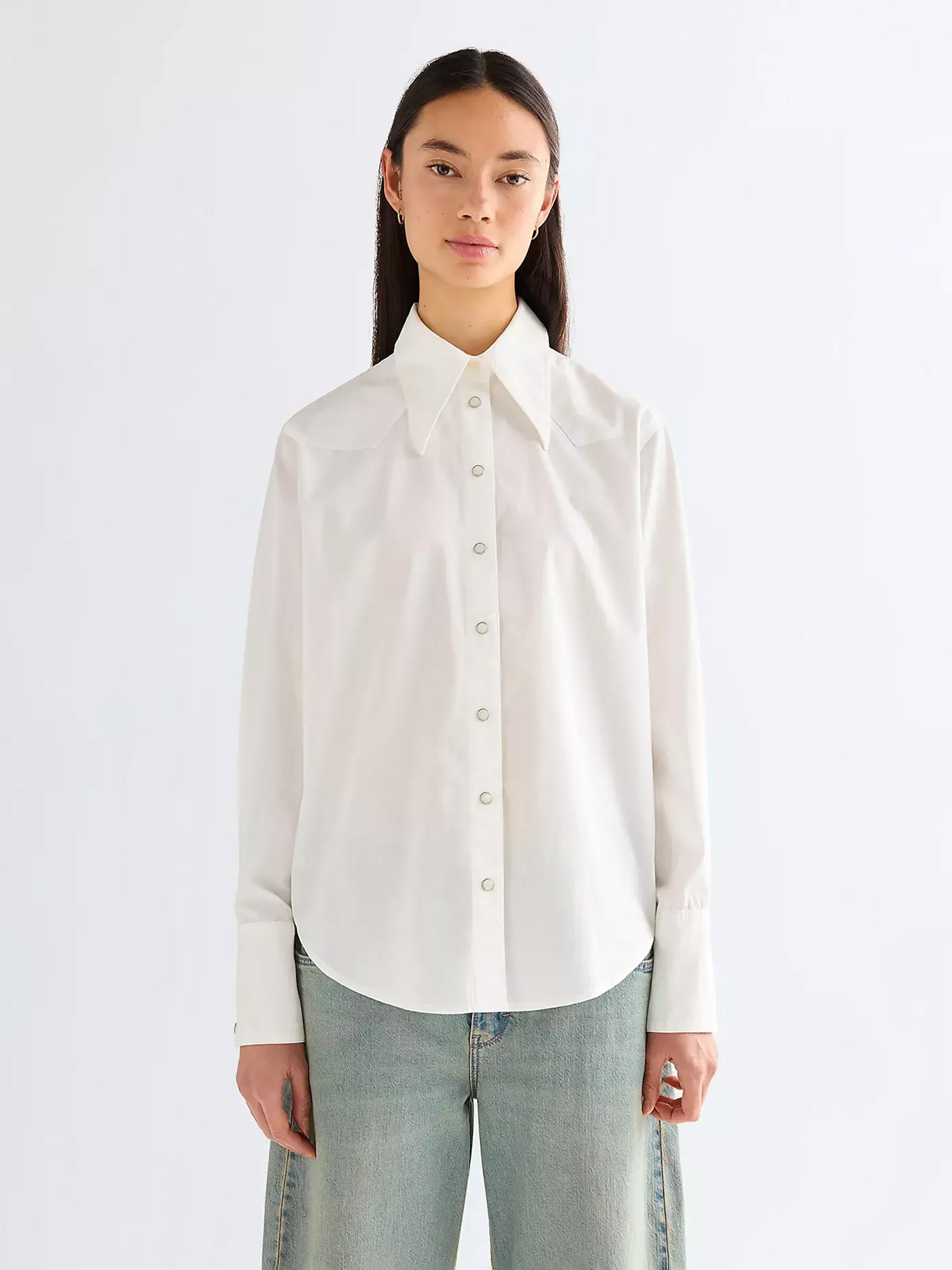 Deze witte blouse van Wrangler heeft een klassieke look en een stoere western uitstraling. De drukknopen en de uitgesproken puntkraag zorgen voor karakter en maken deze blouse leuk om zowel open als dicht te dragen. Perfect op een jeans voor een tijdloze combinatie die altijd werkt.